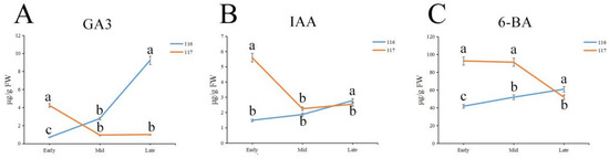 In the endogenous hormone analysis, we measured the contents of Gibberellin A3 (GA3), indole-3-acetic acid (IAA) and 6-Benzylaminopurine (6-BA). The test results showed that the expression levels of the three hormones were different between the two varieties (Figure 11). The content of GA3 showed a decreasing trend in ‘117’ and an increasing trend in ‘116’, and the content in the middle and late periods was higher in ‘116’. The levels of IAA and 6-BA showed similar trends; they were higher in ‘117’ than in ‘116’ and presented a decreasing trend in ‘117’ and an increasing trend in ‘116’.