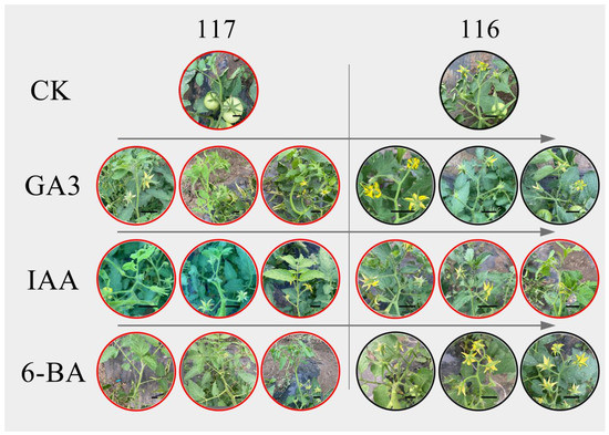 Tomato flowering reversion significantly changed the phenotypes of the two experimental materials treated with different concentrations of GA3, IAA and 6-BA (Figure 12). After GA3 treatment, plant height increased significantly and flowering reversion became more obvious, with a large number of vegetative branches appearing at the tips of the inflorescences; however, flowering was not reversed in ‘116’. After IAA treatment, the most obvious change was the reversal of flowering in ‘116’ plants. After 6-BA treatment, although flowering reversion was not observed, the vegetative branches grew rapidly. With increasing concentrations of the three hormones, the development of flowering reversion became more obvious and vegetative branches appeared earlier.