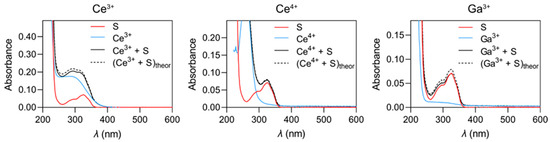 Pearson’s principle of hard-soft acid–base theory (HSAB) is a simple rule for predicting the stability of complexes formed between metal ions and ligands. Undoubtedly, it is a very useful concept, but we must be aware that it also has some limitations (e.g., it is very general and has no direct quantitative scale for Lewis acid-base strength; treatment of ambidentate reactivity; many exceptions occur, etc.) [30,31,32,33]. Of the ions tested, Zn2+ and Pb2+ are considered intermediate (borderline) acids, while Ce3+, Ce4+, and Ga3+ ions are hard acids [31,34]. Cerium ions have already been shown to form complexes with amino acids and dipeptides [35,36]. Therefore, we first determined whether Ce3+, Ce4+, and Ga3+ ions interacted with the synthetic peptide substrates used in the study or otherwise interfered with the kinetic measurements. We measured the UV-Vis absorption spectra of a representative substrate (Z-Phe-Arg-AMC) in the presence and absence of the metal ions studied (specifically, their salts Ga(NO3)3, CeCl3, and (NH4)2Ce(NO3)6, respectively) in reaction buffer (Figure 1). The substrate produced a broad peak with a maximum at 325 nm and a shoulder at 295 nm. The spectra of the Ga3+ and Ce4+ salts at a concentration of 0.5 mM, which is comparable to the highest concentrations used in the kinetic experiments, produced signals only below 350 nm, while CeCl3 absorbed much stronger below 400 nm. Therefore, the spectra of CeCl3 had to be recorded at a significantly lower concentration (0.05 mM) to obtain a signal intensity comparable to the substrate. Since the excitation wavelength used in the kinetic experiments was 370 nm, all progress curves obtained in the presence of CeCl3 were corrected to account for the inner filter effect [37]. The spectra of the individual salts mixed with the substrate showed no significant shifts in maxima or deviations in intensity from the theoretical sums of the salt and the substrate alone, leading us to conclude that there are no significant interactions or spectral phenomena under these conditions that would interfere with the kinetic measurements of enzyme activity other than correction for the inner filter effect.