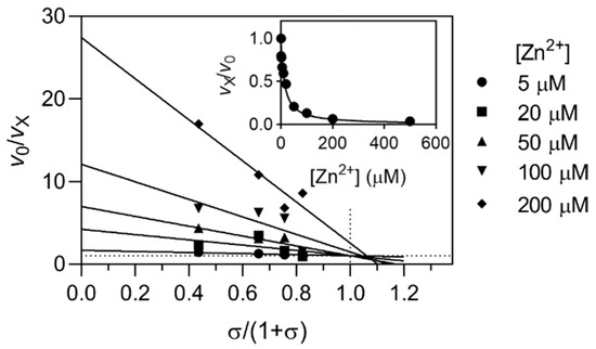 Specific inhibition of cathepsin K by Zn2+ ions. The mechanism was determined by the specific velocity plot using the fluorogenic substrate Z-Phe-Arg-AMC. σ is equal to [S]/Km. An additional titration curve recorded with 5 µM substrate (σ = 1) is shown in the inset. Experiments were performed at 25 °C in 0.1 M sodium acetate buffer pH 5.5.