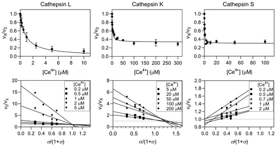 Inhibition of cathepsins L, K, and S by Ce4+ ions. The titration curves are shown in the upper panels and the specific velocity plots used to determine the inhibition mechanisms are shown in the lower panels. Activity was measured with synthetic fluorogenic substrates (Z-Leu-Arg-AMC, Z-Phe-Arg-AMC and Z-Val-Val-Arg-AMC for cathepsins L, K, and S, respectively) at 25 °C in 0.1 M sodium acetate buffer pH 5.5. σ is equal to [S]/Km. The error bars in the titration curves represent the S.E.M. of multiple independent experiments.