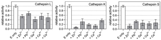 The detrimental effects of heavy metal ions on many enzymes are well-known. However, the details of many of these interactions remain poorly understood. We show that selected metal ions, namely Ce3+, Ce4+, and Ga3+, can inhibit human cysteine cathepsin endopeptidases by different kinetic mechanisms than the specific inhibition observed for ions interacting with catalytic cysteines, e.g., Zn2+ and Pb2+ [18,19]. Although the structural basis for these observations remains to be elucidated, given their relatively low cytotoxicity, this approach may offer new opportunities for targeting these enzymes in vitro and in vivo, either by the ions alone or, more feasibly, in complexes with synthetic inhibitors of these peptidases. To date, numerous chemically diverse inhibitors of cysteine cathepsins have been investigated that achieved high selectivity for their targets as well as high affinity with KX values in the nanomolar range [54,55]. However, in the absence of clinically approved inhibitors, further efforts are needed to develop alternative targeting strategies. The affinity of the metal ions tested here is much lower than that of the most advanced inhibitors and they are also expected to interact nonspecifically with many other protein targets in vivo, making their use alone not feasible. However, the formation of defined metal complexes with suitable ligands might result in inhibitors with higher affinity and selectivity. Often, metal complexes are not stable under physiological conditions. A famous example of such complexes is the ruthenium complex NAMI-A with anticancer activity [56]. The instability of the complexes can lead to the release of free metal ions from the complexes which can then act synergistically with other synthetic inhibitors. Therefore, it is also important to study the interactions of free metal ions with their potential biological targets, such as cysteine cathepsins.