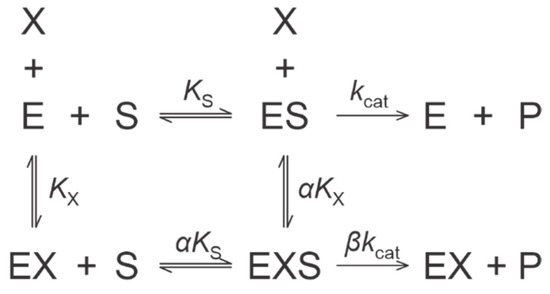 where v0 is the reaction rate in the absence of an inhibitor, KX is the equilibrium dissociation constant of complex EX and σ is equal to [S]/Km. Dimensionless coefficients α and β describe the effects of X on substrate affinity (α) and catalytic rate (β) of the enzyme, respectively. Together, both coefficients define the kinetic mechanism of the inhibitor.