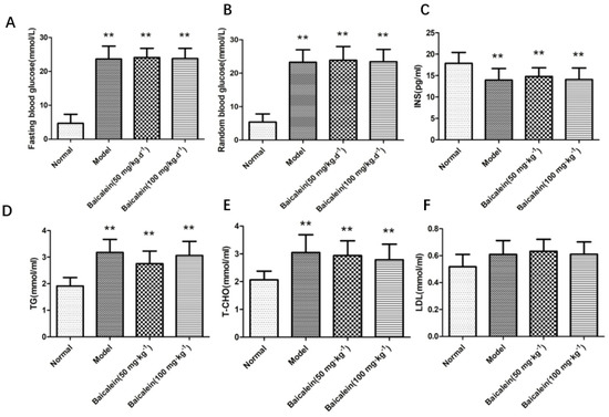 The results in Figure 2 show that fasting blood glucose and random blood glucose were significantly increased in the diabetes group compared to those of the normal group (p < 0.01). After the administration of 50 −1 and 100 mg·kg−1 Baicalein, there was no significant difference in fasting blood glucose and random blood glucose in diabetic rats compared with those of the model group (p > 0.05).
