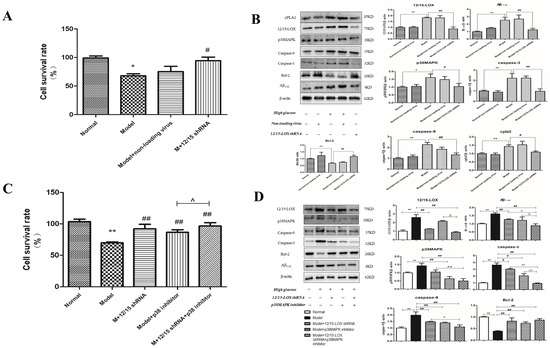 The expression of 12/15-LOX, p38MAPK, caspase-3, caspase-9, cPLA2, phospho-p38 MAPK and Aβ was significantly increased (Figure 5B) in the model group compared with that of the normal group (p < 0.01 and p < 0.05), and the control virus did not significantly affect the expression of these proteins (p > 0.05). The expression of 12/15-LOX, p38MAPK, Aβ, caspase-3, caspase-9, phospho-p38MAPK and cPLA2 was significantly decreased compared with that of the model group (p < 0.01 and p < 0.05), but the expression of Bcl-2 showed the opposite effect (p < 0.01) after the transfection of 12/15-LOX shRNA (p > 0.05).