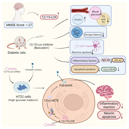 Based on our experimental results, increased plasma levels of 12/15-LOX were observed in patients with diabetic cognitive dysfunction. In addition, we demonstrated that activation of 12/15-LOX leads to diabetic cognitive dysfunction by increasing the inflammatory response in the hippocampus. Inhibition of 12/15-LOX reduced inflammation and damage to hippocampal neurons, downregulated the expression of p38 MAPK and phospho-p38 MAPK, decreased the production of Aβ1-42, and thus significantly improved cognitive dysfunction in diabetes (Figure 6). Therefore, the pathway by which 12/15-LOX regulates p38 MAPK to mediate the inflammatory response and apoptosis may be one of the mechanisms for diabetic cognitive dysfunction. We believe that 12/15-LOX may be used as a biomarker to detect diabetic cognitive dysfunction, and diabetic cognitive dysfunction can be treated or alleviated by inhibiting 12/15-LOX.