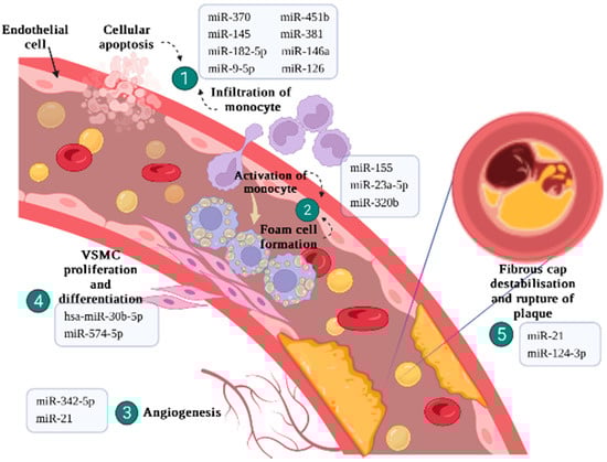 Atherosclerosis plays a crucial role in the pathophysiology of IHD []. Hypercholesterolemia increases the chance of lipoprotein oxidation and macrophages activation []. These further initiate the proliferation of vascular smooth muscle cells (VSMCs) to produce fibrous caps that contribute to plaque stability []. Atherosclerotic lesions that grow slowly over time can trigger the formation of thrombosis and the inflammatory response which releases pro-inflammatory molecules to destabilise the plaque. This multifaceted disease progression, however complex, allows circulating miRNAs to be involved in all steps of atherosclerosis (Figure 2). The interaction of miRNA with target mRNAs, especially, and timing of action in high-risk populations, is dynamic and highly dependent on the affinity of miRNA interaction, subcellular location of miRNAs, the abundance of miRNAs and target mRNAs, and the affinity of miRNA-mRNA interactions [].