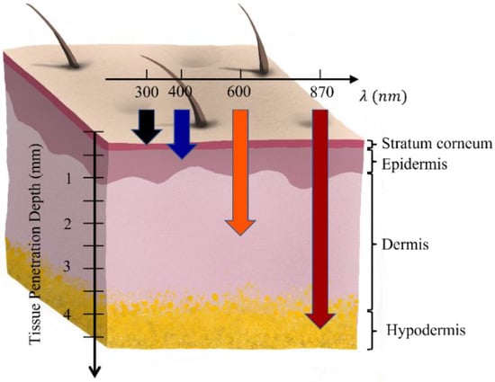 Skin penetration depth of light with different wavelengths [11,12].