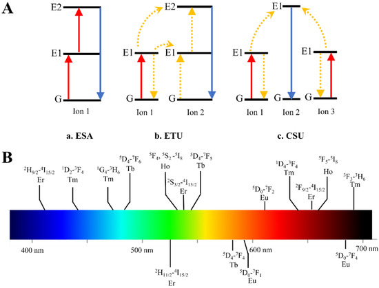 (A) Scheme of upconversion mechanisms. (a). ESA: Excited State Absorption, (b). Energy Transfer upconversion, (c). Cross Relaxation. G: ground state. E1: intermediate state. E2: excited state. Red line: photo excitation process. Blue line: emission process. Yellow dashed line: energy transfer process. (B) The wavelength of the emitted photons from the transition of lanthanide ions can be varied from 400 nm to 700 nm (as is shown in color bar), which shows the tunability of different lanthanide ions (reproduced with permission from [16]).
