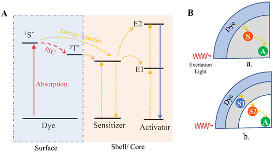 On the other hand, in typical Ln-doped UC nanostructures, the doped Yb3+ ions work as sensitizers to absorb infrared radiation; then, the energy is transferred to activators (Er, Ho, Tm) by a nonradiative process. UCL is generated when the excited activator returns to its ground state. However, Yb 3+ ions, as sensitizers, could only absorb light in a narrow range from 938 nm to 974 nm [23]. The parity-forbidden nature of 4f electronic transitions in Ln ions leads to a relatively low extinction coefficient [24,25]. These limitations could be addressed when considering using organic dyes as sensitizers. A typical organic dye has a relatively broad spectral window (10 times broader) and a large absorption cross-section (around 1000 to 10,000 times higher than Yb3+) [23,25]. Optical properties can also be tuned by the synthetic techniques, and organic dyes can easily be engineered on the surface of UC nanostructures by covalent bonding, electrostatic attraction or physical absorption. The excitation wavelength of NaYF4: Yb, Er UC nanostructures was successfully shifted from the optogenetic neuron excitation window to a biocompatible and deep tissue-penetrable 800 nm wavelength through the sensitization of dye IR 806 [26]. The UCL of NaYF4:20%Yb,2%Er@NaYF4:20%Nd can be largely enhanced by 600-fold by dye IR 808 sensitization [27]. The organic dyes on the surface of UC nanostructures are able to broadly and strongly harvest NIR light and excite to the single state (1S*) and the triplet excited state (3T*) by ISC. Then, the energy is transferred to Ln3+ on the surface of Ln-doped nanoparticles by nonradiative energy transfer processes. The upconversion process in the inorganic core would follow ETU mechanisms (Figure 3A). These processes can happen on either UC core nanostructures or core/shell structures (Figure 3B).