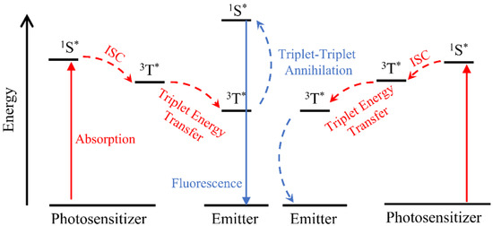 In this anti-stokes process, the photosensitizer is first excited from the ground state to the single state (1S*) by the absorption of the photo with low energy. The triplet-excited state (3T*) is then achieved by the intersystem crossing process (ISC). Because of the long lifetime of triplet-excited state, the triplet energy of the sensitizer is transferred to the annihilator by the triplet energy transfer process [53]. When the two sensitized annihilator triplets collide, a higher energy singlet excited state will be made and generate upconversion fluorescence (Figure 4) [54,55]. TTA-based UC nanostructures, which could absorb NIR light, have their advantages in biological applications, such as deep tissue penetration and low photo-induced damage for the organism [56,57]. The pair of Pd(II) phthalocyanine and rubrene is an example of a photosensitizer and emitter and was reported to be excited by a 725 nm laser and generate 635 nm light [58].