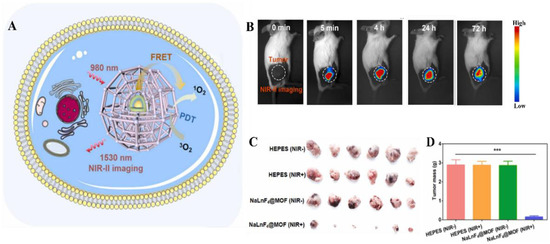 (A) Schematic illustration of NaLnF4@MOF in a cell for NIR-triggered photodynamic therapy and NIR-II bioimaging for diagnosis. (B) NIR-II images of BALB/c tumor-bearing mice treated with NaLnF4@MOF nanoparticles after intratumoral injection (0 min, 5 min, 4 h, 24 h and 72 h). (C) The images and (D) mass of excised tumors after two weeks post-injection (HEPES is the buffer solution as a control, *** p < 0.001) (Reprinted with permission from [84]).