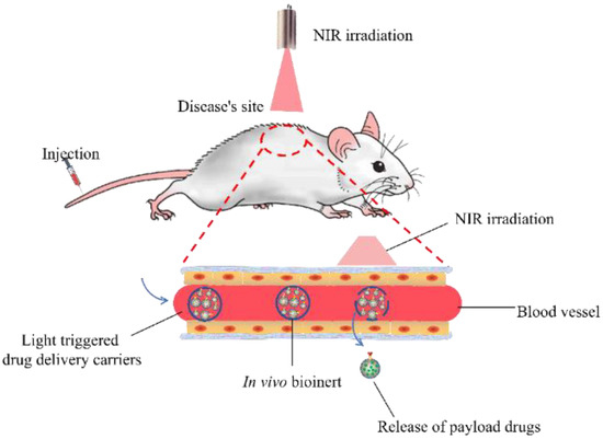 Scheme of the mechanism of the light-triggered drug vehicles (administered by intravenous injection and triggered by light when approaching the targeted sites).