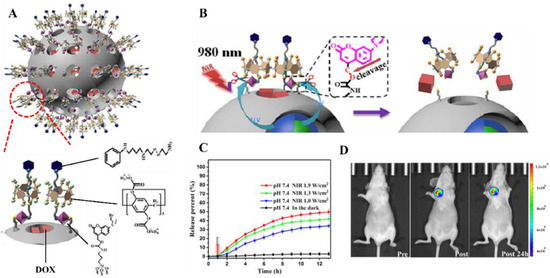 An NIR-triggered drug carrier was also designed based on the obvious structural change caused by the amphiphilicity change of copolymers. Cationic conjugated polyelectrolyte brush (CCPEB) not only encapsulated the UC nanostructure NaYF4:Yb/Tm but also was abundant in positive charges to carry the siRNA and photosensitizer [136]. Under the IR irradiation, the photodegradable 2-nitrobenzyl functional groups in the polymer structures were decomposed and formed the zwitterionic polymer, which promoted the release of siRNA up to 80%. This system was limited to therapeutic applications. Another well-designed NIR-triggered UC nanostructure-based carrier was fabricated for theranostics including drug releasing and tumor-targeted imaging [137]. The SiO2-coated NaYF4:40%Yb,0.5%Tm@NaGdF4:10%Yb nanocrystals were prepared first. The silica shell is hollow and mesoporous, with a pore size around 3.6 and 4.8 nm, which guarantees the high loading efficiency of the anticancer drugs, e.g., DOX. The NIR-responsive function was realized by anchoring supramolecular valves around the pore orifices (Figure 8A). The linker between the supramolecular valves and the pore surface was coumarin derivatives, which are light-responsive. These valves could efficiently block the release of DOX from the pores under the dark. Once irradiated by 980 nm NIR light, the UC nanostructure-based core could emit 345 nm and 360 nm light (UV region). The emission light with high energy would trigger the photocleavage of coumarin derivatives and open the supramolecular valves (Figure 8B). This releasing rate could be precisely controlled by the NIR irradiation power (Figure 8C). After being intratumorally injected into a tumor-bearing nude mouse, the NIR luminescent signal could even be detected from the tumor site after 24 h post-injection (Figure 8D), which made this system a candidate bio-probe for tumor diagnosis. In addition, Ru complexes can also work as photoactive molecular valves to control the drug release in mesoporous silica-coated UC nanostructure-based carriers [133].