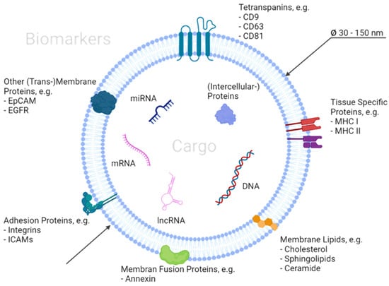 Exosomes are formed inside the cell by inward budding of the endosomal membrane, and therefore represent a snapshot of the current status of the donor cell. After an intermediate state as intraluminal vesicles within multivesicular bodies, they are exocytosed. These vesicles are then referred to as exosomes. Outside the cell, exosomes can act as intercellular transporters, carrying their protected cargo to other cells [23]. Depending on the location of the cell, it is, thus, possible to isolate exosomes from nearly all accessible body fluids, such as systemic body fluids (e.g., blood, breast milk, follicular fluid, seminal fluid, serum, urine) and proximal body fluids (e.g., cerebrospinal fluid, saliva, sweat, tears) to analyze their composition [24].
