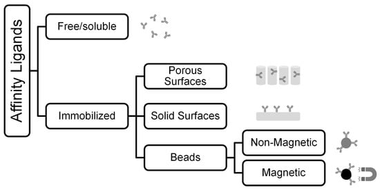 Affinity methods can generally be categorized by the matrix onto which the affinity ligand is coupled. Besides the immobilization of affinity ligands on spherical polymer beads or monoliths, as in AC, they can also be attached to plates, magnetic particles, and membranes, or be soluble (see Figure 2). In the free ligand approach, the target molecules are first labelled by binding to ligand molecules in solution. In the following, either the ligand itself can be bound; thus, the target structure can be separated, or a signal reaction with the ligand can be used to detect the target structure. In the immobilized ligand approach, there is no labelling of the exosomes with free ligands, but direct separation or detection by binding to an immobilized ligand. Possible ligands are proteins, antibodies, and aptamers. The latter are synthetic single-stranded DNA or RNA sequences. They have similar binding properties to antibodies, but are more stable, less expensive and show less variance in their production [74].
