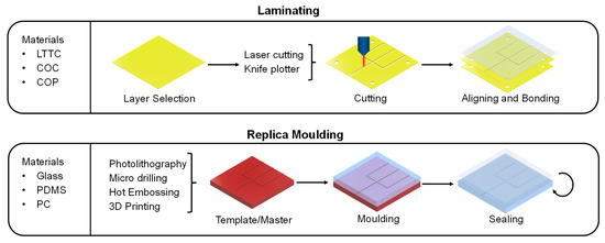 Overview of the two manufacturing processes laminating and replica-molding for microfluidic devices.