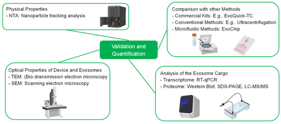After designing a microfluidic device for the separation of exosomes, it is necessary to analyze and validate the results of the separation. Determination of the size distribution and quantification of the separated exosomes can be carried out by utilizing nanoparticle tracking analysis (NTA). A disadvantage of NTA is its unspecificity towards exosomes. Thus, the quantification process can be interfered with by lipoproteins and protein aggregates. To overcome the unspecificity, multiple enzyme-linked immunosorbent assays (ELISA), fluorescent assays [26], surface-enhanced Raman scattering (SERS) approaches [129] and nanoflow cytometry setups [130] have been developed. In addition, novel methods, such as the use of electrokinetic detection with a microcapillary [131] and droplet digital ELISAs (ddExoELISA) [132], show great potential to simplify the detection process and enhance the detection limit. As already mentioned, exosomes carry proteins and RNA fragments, which can be used as prognostic and diagnostic markers for several diseases. To analyze the cargo, captured exosomes must be lysed first. Western blot (WB) analysis, sodium dodecyl sulfate polyacrylamide gel electrophoresis (SDS-PAGE) and nano liquid chromatography mass spectrometry (nano LC–MS) can deliver insights into the proteome and transcriptome of the captured exosomes [7]. Another specialized method to analyze the RNA cargo is (real time) quantitative polymerized chain reaction (qPCR). When developing a new device, it can be feasible to optically inspect the microfluidic device and the exosomes to evaluate the performance of the separation. This can be performed by scanning electron microscopy (SEM) or (bio-)transmission electron microscopy (TEM). The design of sensors and detectors is a large interdisciplinary field. An overview of the techniques to analyze exosomes is shown in Figure 6. For LOC and µTAS devices, the development of transportable detectors that can be implemented into microfluidic devices has accelerated in recent years. Since this topic is beyond the scope of this work, the reader is referred to current reviews, e.g., [74,133]. However, we want to also highlight the recent advances for extracellular vesicle detection and sensing. The newest technologies for efficient sensing include refractive index-based sensors and magneto-electrochemical sensors [134,135]. A great overview of the different sensing technologies, ranging from plasmon resonance, scattering, ELISA and electrochemical-based assays, is given by Im et al. [136]. Current commercially available kits for exosome isolation have been reviewed very recently by Shirejini and Inci [60]. They highlight the advantages and disadvantages of commercially available kits, such as high-throughput, cost-effectiveness, time-effectiveness and others. They review membrane-based methods, precipitation-based methods, size-exclusion-based methods and immune-affinity-based methods [60]. The commercially-available products are as follows: ExoMir (Bioo Scientific) as the membrane-based method; EXO-Prep (Hasna BioMedLife Sciences), Exosome Purification Kit (Norgen Biotek), Exo-Spin Isolation Kit (Cell Guidance Systems), ExoQuick Exosome Precipitation (System Biosciences), PureExo Exosome Isolation Kit (101 Bio), miRCURY Exosome Isolation Kit (Exiqon), Total Exosome Isolation Reagent (Invitrogen), Minute High-Efficiency Exosome Precipitation Reagent (Invent Biotechnologies), RIBO Exosome Isolation Reagent (RIBO) as the precipitation-based methods; qEV (iZON Science), EVSecond (GL Sciences), ExoLutE (Rosetta Exosome Company), PURE-Evs (HansaBioMed) as the size-exclusion-based methods; Exosome-Human EpCAM isolation reagent (Thermofisher), Exosome Isolation Kit CD81/CD63 (Miltenyi Biotec), Exosome Isolation and Analysis kit (Abcam), MagCapture Exosome Isolation Kit PS (FUJIFILM Wako Pure Chemical Corporation) as the immune-affinity-based methods; ExoEasy Maxi Kit (Qiagen) and Capturem Exosome Isolation Kit (Takara Bio) as the affinity-spin-column-based methods.