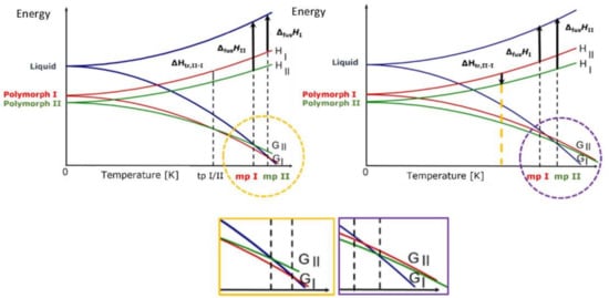 For crystals of organic molecules, such as most APIs, the energy difference between different polymorphic forms is usually of the order of few kJ/mol, mainly because of the entropic contribution to the free energy. Polymorphs can be grouped in two major categories depending on whether there is a transition point between two solid phases at a given temperature, i.e., the two phases interconvert via a phase transition, or the two phases do not share a point of identical free energy before melting, i.e., the two phases do not interconvert via a phase transition. In the first case, the two phases are said to be enantiotropically related, while in the second case the two phases are said to be monotropically related (see Figure 2) and will be discussed briefly in the following.