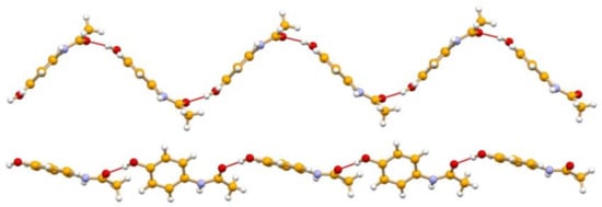 The crystallization of paracetamol from methanol affords a so-called Form I, which although poorly compressible, is the marketed phase. Form I [25] is the thermodynamically stable form at all temperatures, and melts at 440–445 K with a ΔHfus of 26–34 kJ mol−1. Crystallization from benzyl alcohol yields the highly compressible Form II [26], which is metastable, and melts in the range 427–433 K with a ΔHfus of 26.4–33.5 kJ mol−1. The difference in the hydrogen bonded chains, constituting the basic packing motif in both forms, is shown in Figure 3. A Form III has also been discovered, which can only be stabilized under certain conditions [27].