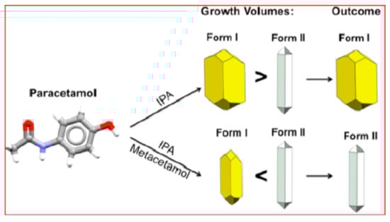 The two forms have different crystal shapes. Moreover, Form II is elusive and hard to crystallize, unless selective impurities are present in solution. Recently, it has been shown that metacetamol, used as an additive, inhibits the growth of Form I and favors the growth of Form II (see Figure 4) [28].