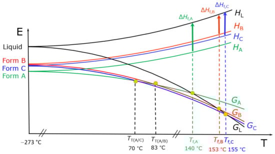 Another example is provided by the drug Bitopertin, which has been shown to possess three unsolvated, non-hygroscopic crystalline forms, designated as form A, form B, and form C [32]. Form A is enantiotropically related to form B, with form A being the thermodynamically stable polymorph below the transition temperature (~83 °C). Form A and form C are also enantiotropically related, with form A being the thermodynamically stable form below the calculated transition temperature (~70 °C). Form B and form C are otherwise monotropically related. The complex relationship between the three phases is shown in Figure 6.