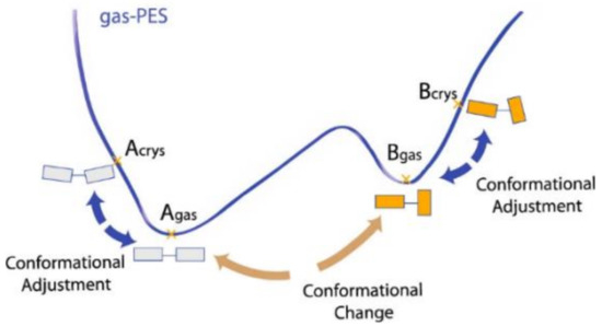 Schematic representation of the concepts of “conformation change” and “conformational adjustment” in a PES (potential energy surface) profile. Reprinted with permission from Ref. [33]. 2014, American Chemical Society.