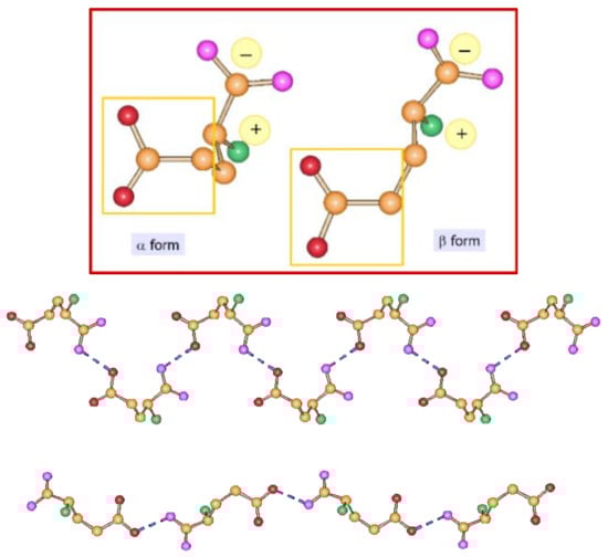 (Top) The α and β forms of L-glutamic acid and a comparison of the hydrogen bonded chains in the α (middle) and β (bottom) polymorphs.