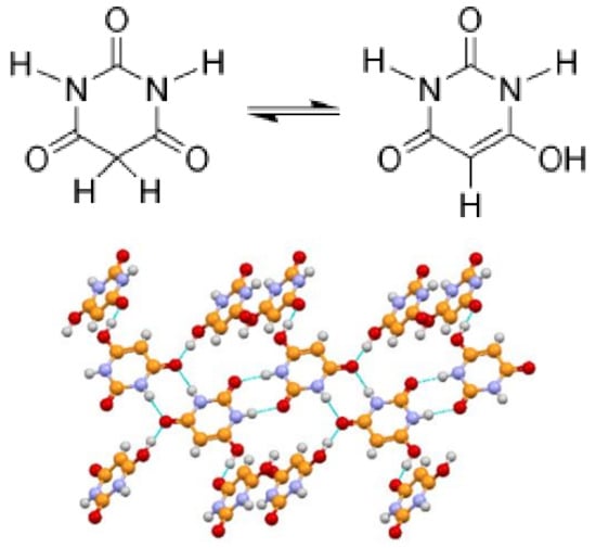- Schmidt, M.U.; Brüning, J.; Glinnemann, J.; Hützler, M.W.; Mörschel, P.; Ivashevskaya, S.N.; Van De Streek, J.; Braga, D.; Maini, L.; Chierotti, M.R.; et al. The Thermodynamically Stable Form of Solid Barbituric Acid: The Enol Tautomer. Angew. Chem. Int. Ed. 2011, 50, 7924–7926. [Google Scholar] [CrossRef] [PubMed]