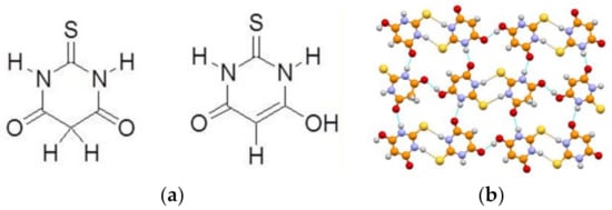 (a) Keto/enol tautomerism of thiobarbituric acid and (b) the crystal structure of the most stable form at room temperature, showing the presence of both the keto and enol forms [37].