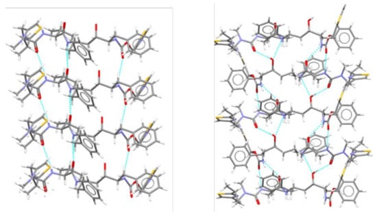 The hydrogen bonding networks in crystals of Ritonavir form I (left) and form II (right) [38].