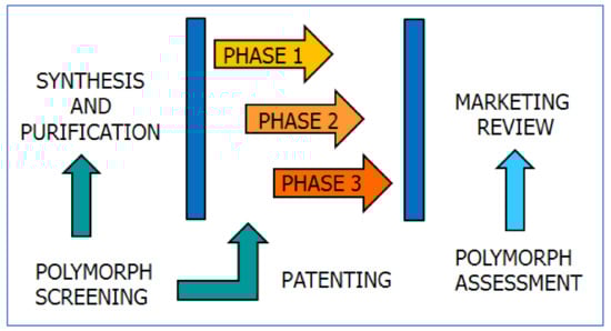 Polymorph assessment has indeed become part of the system of quality control in the pharmaceutical industry [4,5,6]. It is necessary to make sure that the scaling-up from laboratory preparation to industrial production does not introduce variations in crystal forms. Polymorph assessment also guarantees that the product conforms to the guidelines of the appropriate regulatory agencies and does not infringe on the intellectual property protection that may cover other crystal forms. The schematic diagram in Figure 13 shows how polymorph screening can lead to relevant patenting in the process of drug development, while continuous polymorph assessment will be required once the drug is on the market.