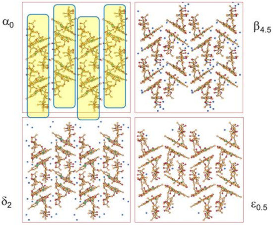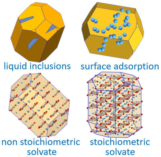 An API can form polymorphs, i.e., different crystals of the same chemical entity; however, an API can also form different crystal structures with solvent molecules, i.e., solvates [52]. Crystalline solvates may present different stoichiometries, i.e., mono-, di-, tri-solvates, etc. or they can be non-stoichiometric. In this latter case, they adsorb/release a variable number of solvent molecules depending on the temperature, relative humidity (in the case of hydrates), or other physical conditions. Solvate formation is also largely unpredictable. Solvates are sometimes called “pseudo-polymorphs”, but this practice ought to be discouraged, since solvates have a different chemical composition from the pure API. Moreover, crystalline solvates can show polymorphism, i.e., the same compositions, the same API/solvent stoichiometric ratio, but different crystal structures.