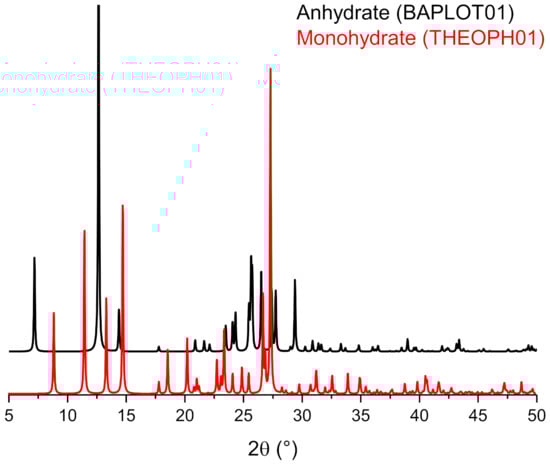 - Zhu, H.; Yuen, C.; Grant, D.J.W. Influence of Water Activity in Organic Solvent + Water Mixtures on the Nature of the Crystallizing Drug Phase. 1. Theophylline. Int. J. Pharm. 1996, 135, 151–160. [Google Scholar] [CrossRef]