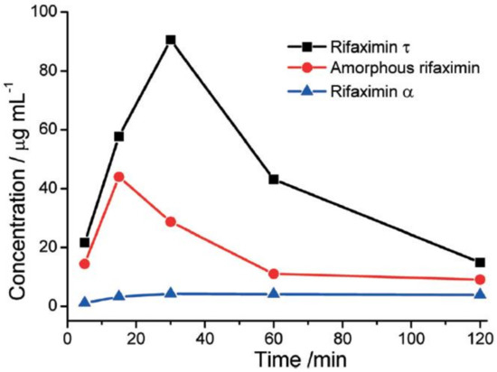 - Braga, D.; Grepioni, F.; Chelazzi, L.; Campana, M.; Confortini, D.; Viscomi, G.C. The Structure-Property Relationship of Four Crystal Forms of Rifaximin. CrystEngComm 2012, 14, 6404–6411. [Google Scholar] [CrossRef]