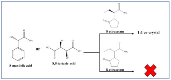 - George, F.; Norberg, B.; Robeyns, K.; Wouters, J.; Leyssens, T. Peculiar Case of Levetiracetam and Etiracetam α-Ketoglutaric Acid Cocrystals: Obtaining a Stable Conglomerate of Etiracetam. Cryst. Growth Des. 2016, 16, 5273–5282. [Google Scholar] [CrossRef]