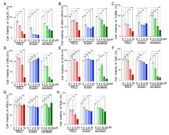 HNSCC cells are sensitive to ferroptosis-inducers. (A–F) The cell viability of CAL33 (A), AMC-HN-8 (B), TU686 (C), CNE-2 (D), S18 (E), and S26 (F) were tested by CCK-8 24 h after treatment with the indicated concentrations of three types of ferroptosis-inducers (RSL3, Erastin, or Sorafenib). (G,H) Cell viability of neural stem cells (NSCs) (G) and N2A cells (H) tested by the same method as the HNSCC cells as the control group. n = 3. The mean ± SEM of three independent experiments is shown. A two-way ANOVA, followed by an uncorrected Fisher’s LSD test, was used for statistical analysis. * p < 0.05; ** p < 0.01; *** p < 0.001; n.s.: not significant. Black triangles: number of experiments with RSL3 treatment; dots: number of experiments with Erastin treatment samples; diamonds: number of experiments treated with Sorafeninb.