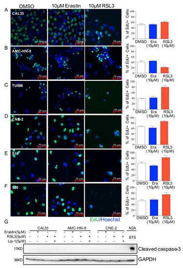 Morphology of HNSCC cells after ferroptosis-inducer treatment. (A–F). Representative images of EdU staining in CAL33 (A), AMC-HN-8 (B), TU686 (C), CNE-2 (D), S18 (E), and S26 (F). Cells were labeled for 1 h after treating for 23 h with DMSO, 10 μM of Erastin or RSL3. The cells were then fixed for EdU antibody staining. Images represent two independent experiments. Scale bar = 50 μm. The quantification of the average EdU-positive cells (%) of each cell line is shown on the right. Era: Erastin. (G) HNSCC cells were treated with DMSO, 5 μM Erastin, 5 μM RSL3, or 200 nM STS for 24 h, with or without 5 μM liproxstatin-1 treated for 2 h in advance. Protein extraction was prepared for Western blotting analysis with antibodies against cleaved caspase-3 and GAPDH. The images represent three independent experiments.