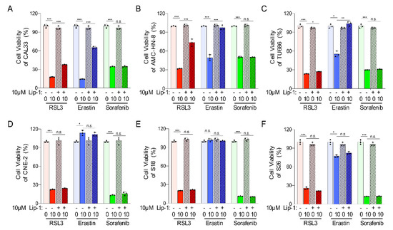Ferroptosis inhibitor liproxstatin-1 can block ferroptosis in HNSCC cells. (A–F) The viability of CAL33 (A), AMC-HN-8 (B), TU686 (C), CNE-2 (D), S18 (E), and S26 (F) was tested by CCK-8 at 24 h after treatment with ferroptosis-inducers (RSL3, Erastin, or Sorafenib), with or without a 10 μM liproxstatin-1 for 2 h in advance. The mean ± SEM of three independent experiments is shown. A two-way ANOVA, followed by an uncorrected Fisher’s LSD test, was used for statistical analysis. * p < 0.05; ** p < 0.01; *** p < 0.001; n.s.: not significant. Black triangles: number of experiments.