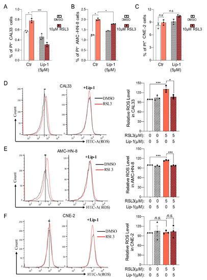 Ferroptosis in cells is accompanied by the upregulation of lipid peroxide from the cell membrane. The accumulation of these reactive oxygen species (ROS) will destroy the redox balance of cells, resulting in ferroptosis. To confirm there is a ferroptosis process in HNSCC cells, the ROS level was measured by using lipid-soluble small molecule BODIPY581/591 C11. A FACS analysis reveals that, similar to PI staining, RSL3 triggered an induction of ROS, which can be eliminated by Lip-1 only in tongue squamous (CAL33) and laryngeal squamous (AMC-HN-8) cell carcinoma (Figure 4D,E) but not in nasopharyngeal carcinoma cells (CNE-2) (Figure 4F). All these results suggest that, whereas tongue squamous and laryngeal squamous cell carcinoma are sensitive to ferroptosis-inducers, nasopharyngeal carcinoma cells are resistant to the ferroptosis induction.