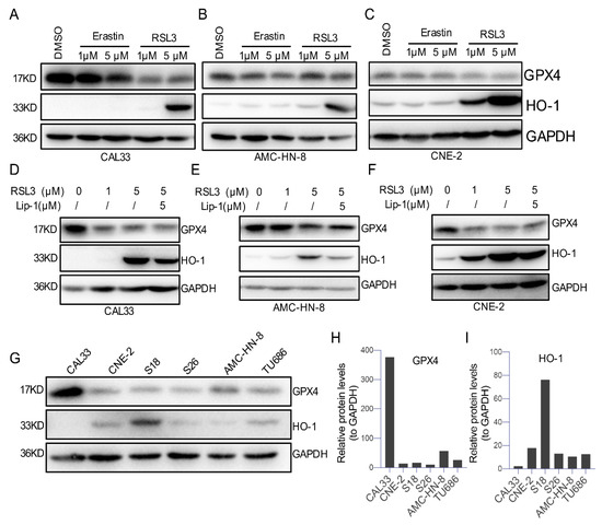 Glutathione peroxidase 4 (GPX4), an antioxidative enzyme and hallmark of ferroptosis [6], is generally downregulated upon ferroptosis [6]. To further confirm a ferroptosis process in HNSCCs, we measured the levels of GPX4 and heme oxygenase-1 (HO-1) in HNSCC cells treated with the ferroptosis-inducers Erasin or RSL3 (Figure 5A–C). The Western blot analysis data show an apparent reduction in the GPX4 level after being treated with 5 μM of Erastin or RSL3 in all tested HNSCC cell lines (CAL33, AMC-HN-8, and CNE-2), where 1 μM of RSL3 but not Erastin decreased GPX4 in CAL33 and CNE-2 cells (Figure 5A–C). Correspondingly, 5 μM of RSL3 upregulated the level of HO-1 firmly among these cells, and 1 μM of RSL3 only caused a high level of GPX4 in CNE-2 cells (Figure 5A–C). Moreover, either downregulated GPX4 or upregulated HO-1 trigged by 5 μM of RSL3 can be reversed by preincubating cells with the ferroptosis-inhibitor Lip-1 (Figure 5D–F). These results suggest that the expression of GPX4 or HO-1 is not responsible for the different viability outcomes after treatment with ferroptosis-inducers.