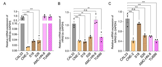Expression of RAS family genes in HNSCC cells. (A–C) A quantification polymerase chain reaction (qPCR) was used to quantify the expression of KRAS (A), HRAS (B), and NRAS (C). The reference genes used were GAPDH. The mean ± SEM of three independent experiments are shown. A one-way ANOVA, followed by a Dunnett’s multiple comparisons test, was used for statistical analysis. ** p < 0.01; *** p < 0.001; n.s.: not significant. Black dots represent number of experiments.