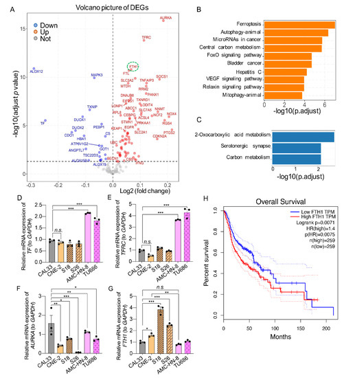 To further explore the molecular mechanism responsible for the sensitivity of HNSCCs to ferroptosis-inducers, we analyzed the expression of ferroptosis-related genes (FRGs) [30] in HNSCC patients. For that, the gene expression profile of 559 HNSCC patients and 136 control cohorts from the GEO database were enrolled, and the different expression FRGs were analyzed. We found that 91 FRGs (out of 256) were differentially expressed, with 21 being downregulated and 70 being upregulated (Figure 7A). KEGG pathway analysis showed that the top enrichment for the upregulated genes was the ferroptosis pathways, and 2-monocarboxylic acid metabolism was the top downregulated pathway enrichment (Figure 7A–C) in HNSCCs. Among these different expressed FRGs, whereas ALOX12 (arachidonate 12-lipoxygenase, 12S type) and TF (transferrin) were strongly downregulated, AURKA (aurora kinase A), TFRC (transferrin receptor), and FTH1 (ferritin heavy chain 1) were strongly upregulated. These findings indicate that these FRGs might be the potential molecular mechanisms involved in regulating ferroptosis in HNSCC.