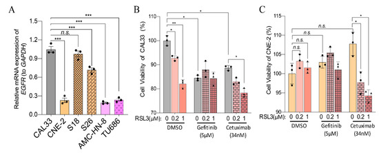 Drug resistance in chemotherapy is a significant dilemma in the field of antitumors. The EGFR monoclonal antibody Cetuximab is approved by the FDA as a radiation sensitizer, alone or in combination with chemotherapy, for treating patients with recurrent or metastatic disease [36]. It has been shown that the EGFR inhibitor Gefitinib effectively blocks the growth of HNSCCs [37]. We found that nasopharyngeal carcinoma cells (CNE-2) also express a lower level of EGFR compared with CAL33, S18, and S26 (Figure 9A). Consistent with this, whereas both Cetuximab and Gefitinib treatments impair the viability of CAL33 cells, CNE-2 cells are also resistant to the EGFR inhibitor Gefitinib and the EGFR monoclonal antibody Cetuximab (Figure 9B,C). Excitingly, combining Cetuximab with RSL3, even with as low as 0.2~1 μM, significantly impaired the viability of CNE-2 cells compared with Cetuximab alone (Figure 9C). This synergetic effect was also taken in RSL3-treated CAL33 cells (Figure 9B). It is puzzling that a combination of RSL3 and Gefitinib has an ignorable effect on both CAL33 or CNE-2 cells. Nevertheless, a recent study has also shown that a cotreatment with β-elemene—a natural product isolated from the Chinese herb Curcumae rhizome—and Cetuximab sensitizes KRAS mutant metastatic colorectal cancer cells by inducing ferroptosis [38]. Their synergistic effect, via a combinative treatment with RSL3 and Cetuximab on ferroptosis- and Cetuximab-resistant HNSCC cells is interesting, which will provide a prospective therapeutic strategy for treating EGFR-resistant HNSCCs.