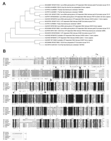 Similarity of MoDHX35 homologs. (A) Phylogenetic relationship of MoDHX35 (MGG_02518) and its closely related proteins in Magnaporthe oryzae, Saccharomyces cerevisiae and Homo species, calculated with neighbor-joining method using the MEGA 5.0 program. (B) Amino acid sequences of HsDHX35 (NP_068750.2) from humans, NcDHX35 (XP_963507.1) from Neurospora crassa, PrDHX35 (XP_038929158.1) from Penicillium roqueforti, AnDHX35 (EHA17759.1) from Aspergillus nidulans and GzDHX35 (XP_381721.1) from Gibberella zeae (Fusarium graminearum) were aligned using Clustal W. The identical amino acids are highlighted against a black background, conserved residues are shown on a dark gray background, and similar residues on a light gray background.
