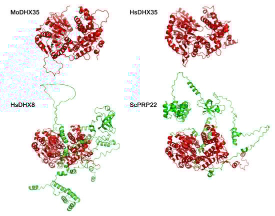 Three-dimensional structures of MoDHX35, HsDHX35, HsDHX8 and ScPRP22 generated by the structure prediction server AlphaFold2 database (https://www.cloudam.cn/v2/console/create-job, accessed on 1 December 2021). The conserved portions of the proteins are in red.