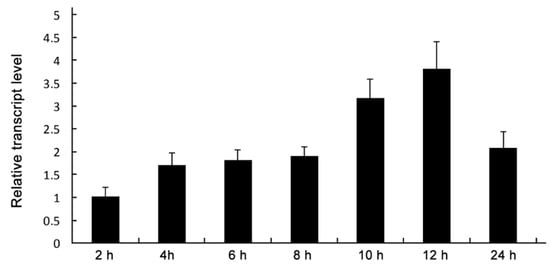 To assess the expression profile of MoDHX35, the conidia suspension was allowed to germinate and form appressoria on plastic slices, and the relative transcription levels of the gene were tested using quantitative RT-PCR. MoDHX35 was found up-regulated gradually during germination and appressoria formation, reaching the peak value at 10 to 12 h for induction, the key period of appressorium formation (Figure 3).