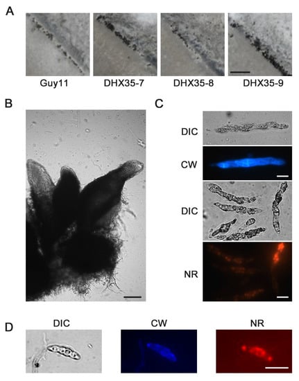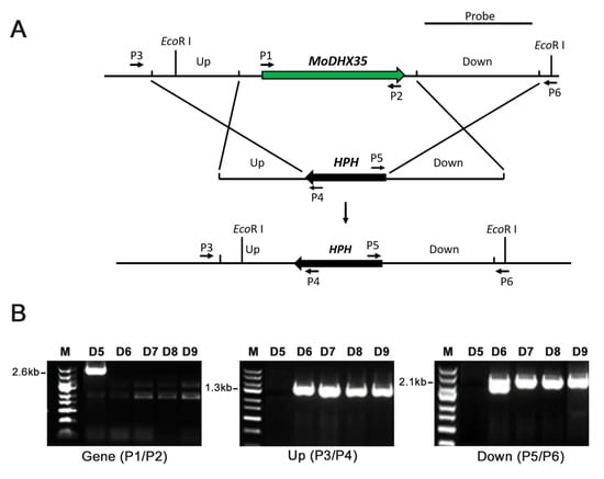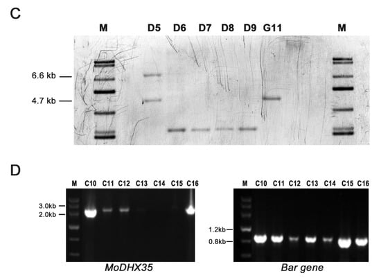 2.3. Gene Replacement of MoDHX35 and Mutant Recovery