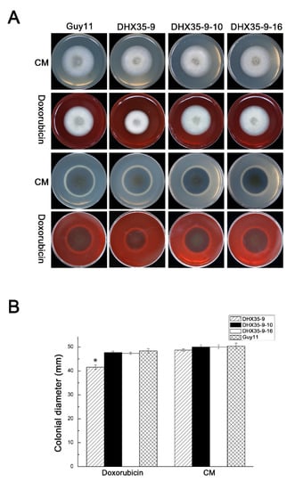 Doxorubicin, which is usually used to cure cancer, can block the synthesis of nucleic acid. Here the null mutant, complemented transformants and wild-type Guy11 were grown on CM plates with 75 μg/mL doxorubicin. The pictures show clearly that the null mutant growth rate is slower than that of Guy11 (Figure 5A,B). However, the complemented mutants grow at almost the same rate as that of the wild type. These results indicate that MoDHX35 may play an important role in nucleic acid synthesis.