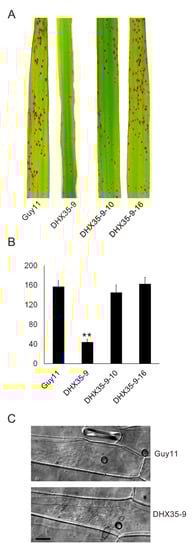 A pathogenicity assay was performed on the rice susceptible cultivar CO39. Conidial suspensions from Guy11, DHX35-9, DHX35-9-10 and DHX35-9-16, in equal concentrations, were spray inoculated onto rice seedlings. At 7 d post inoculation, the rice leaves inoculated with the wild type formed typical symptoms, while the DHX35-9 mutant exhibited significantly reduced virulence compared with that of the wild type. An average of 24.0 ± 2.6 lesions was generated on the 5-cm leaves inoculated with DHX35-9, significantly lower than the 115.0 ± 15.7 caused by Guy11. On the other hand, the complement strains DHX35-9-10 and DHX35-9-16 exhibited comparable virulence to that of the wild type on rice leaves (Figure 7A,B). The data indicate that MoDHX35 is required for the full virulence of the rice blast fungus on rice. We then examined the infection structures on barley leaves under a microscope. As observed on the artificial surface, the DHX35-9 mutant forms appressoria at a reduced rate on barley leaves. Nevertheless, the appressoria of the mutant has infection capability, and the development of the infection hyphae did not exhibit significant difference to those of the wild type (Figure 7C). The data indicate that the attenuated virulence of the MoDHX35 null mutant was due, predominantly, to the reduction in appressoria formation.